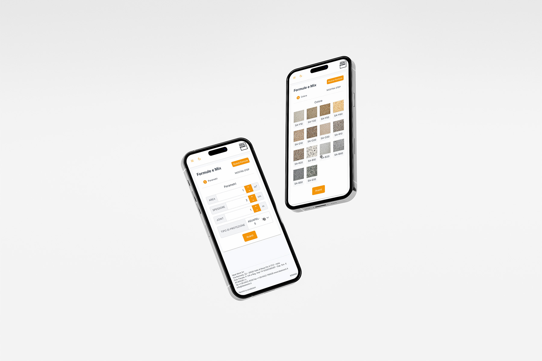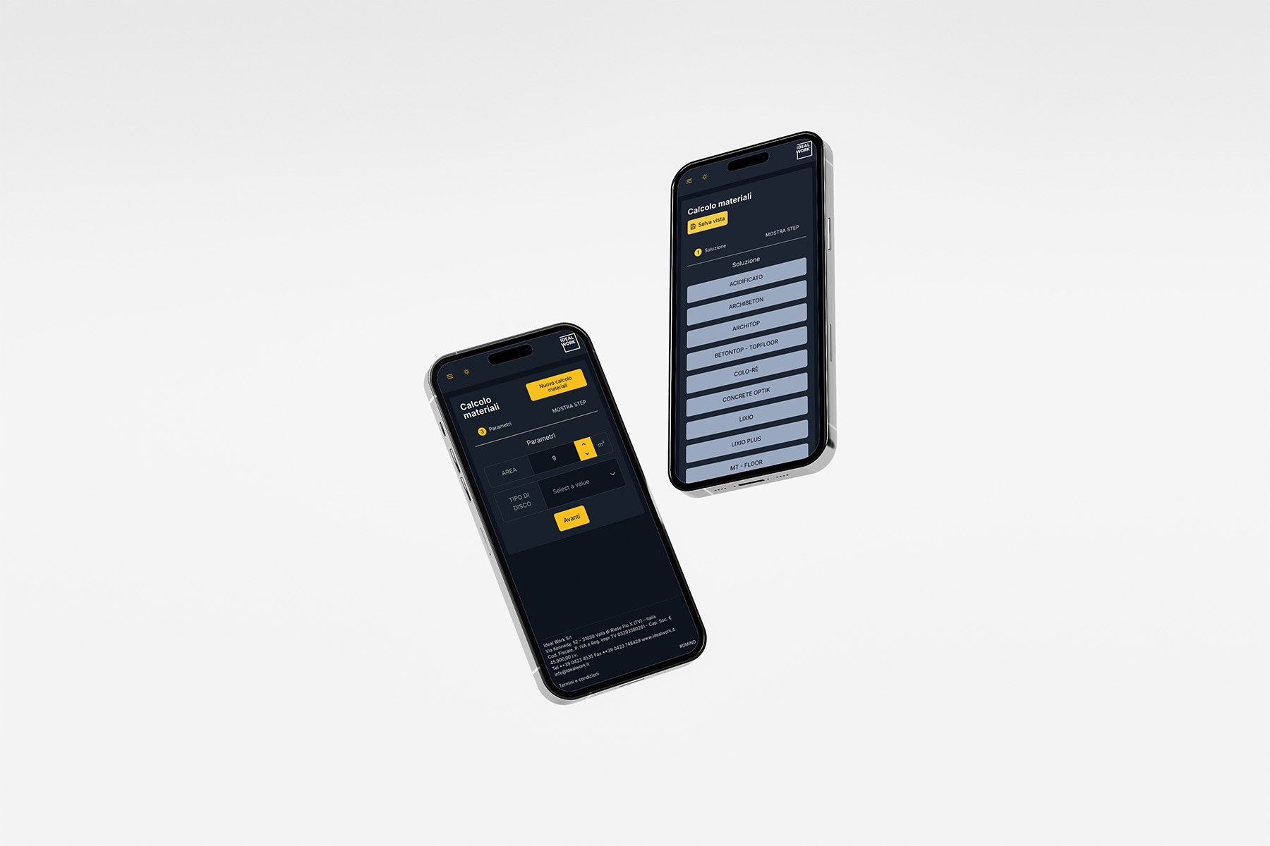 Introduce la superficie, el grosor, el color y la solución: Ideal Work 24/7 te devolverá una lista detallada de los materiales y las cantidades necesarias.